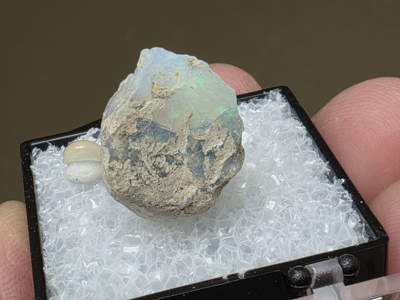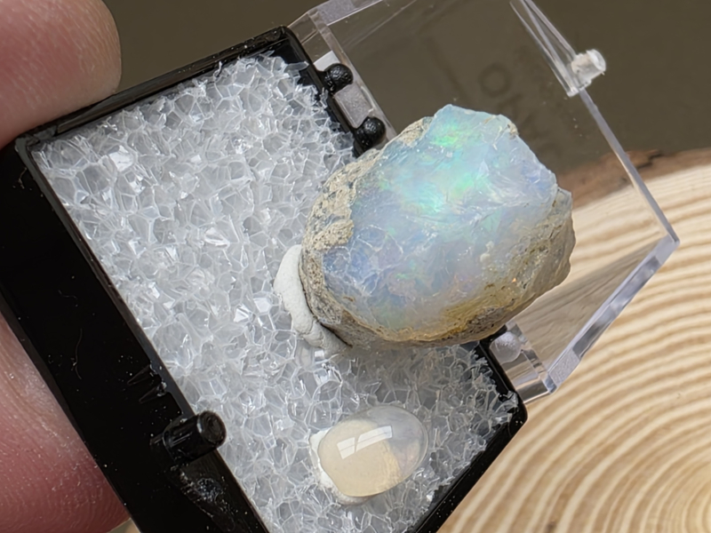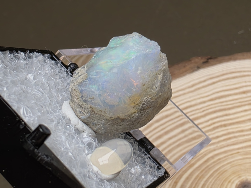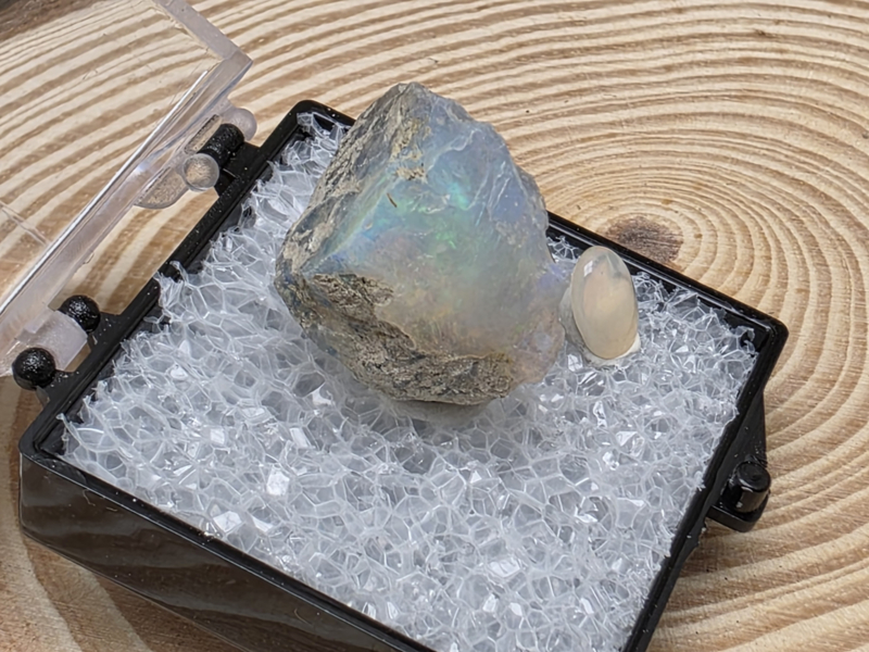 Ethiopisch of welo opaal ruw stukje in doosje met cabuchon