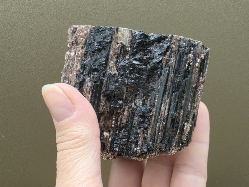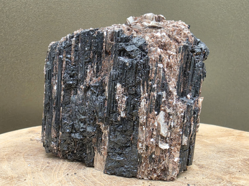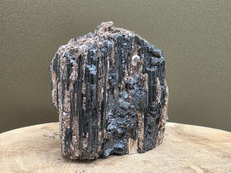Zwarte toermalijn ruw stuk met gouden mica, hematiet en albiet