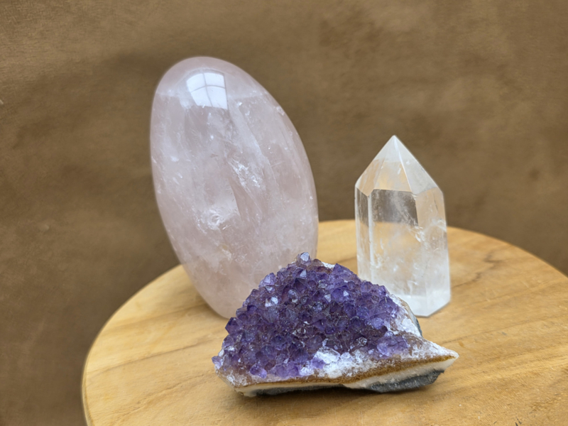 | Grootte | Amethist 6 Bergkristal 6 Rozenkwarts 9 cm |