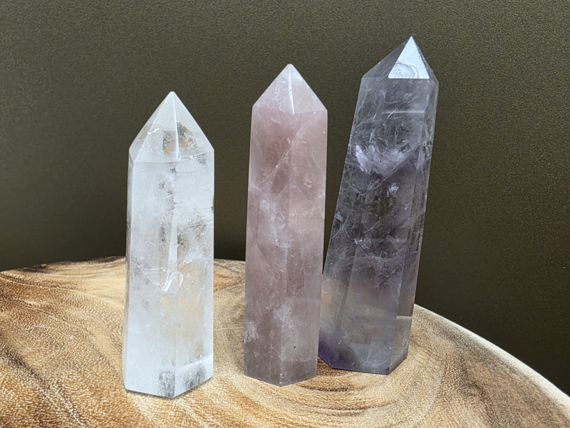 | Grootte | Amethist 10.5 Bergkristal 8.5 Rozenkwarts 9.5 cm |