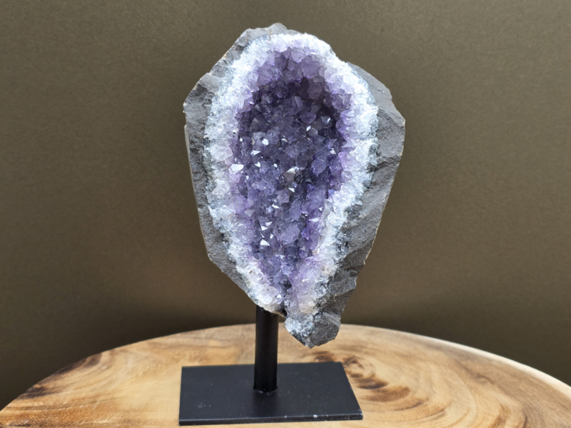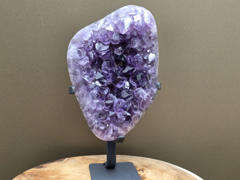 Amethist op standaard uit BraziliëAmethist cluster uit Brazilië op standaard. Neigt naar zwarte amethist door zijn hele donker bruine kleur. U krijgt de steen van de foto.