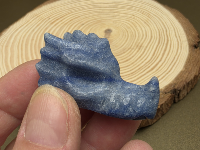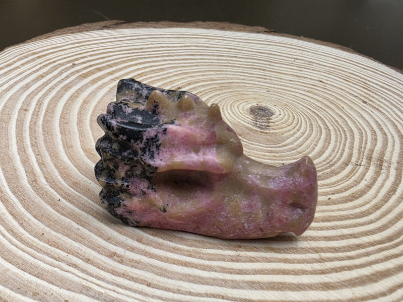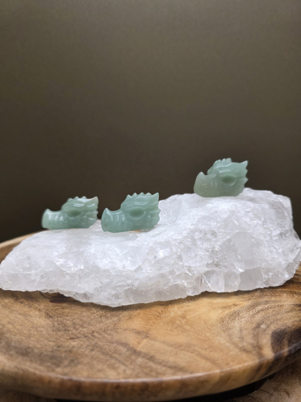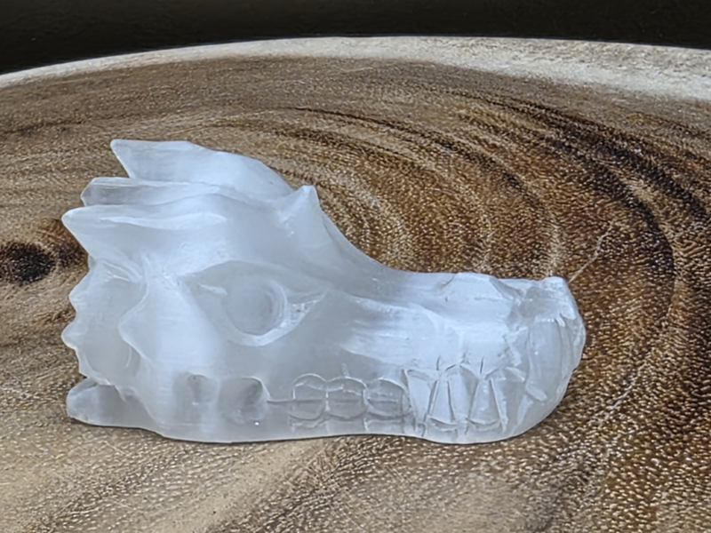 Seleniet/satijnspaat draakDraakje van satijnspaat. Helaas zijn er op de neus puntjes afgebroken. Vandaar korting.