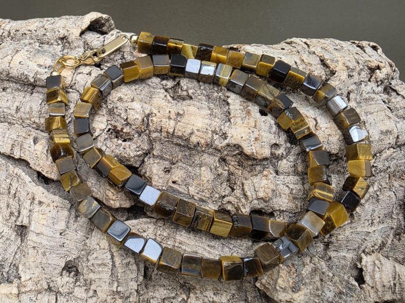 Tijgeroog kettingTijgeroog ketting met vierkante kralen en goudkleurige sluiting. U krijgt het product van de foto.