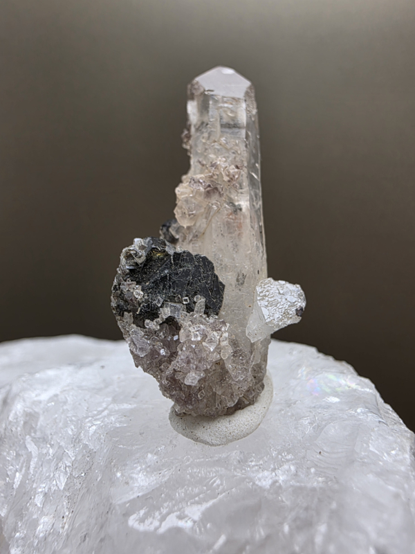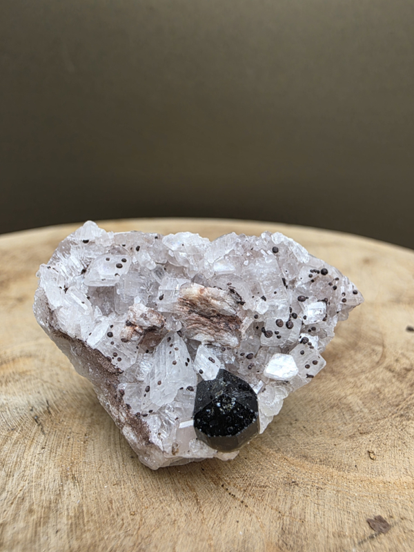 UvietPrachtig stuk uviet. Naast het grote uviet kristal aan de rand van het cluster, zijn de minuscule donkere stipjes verdeeld over het gehele cluster eveneens minuscule uviet kristalletjes.